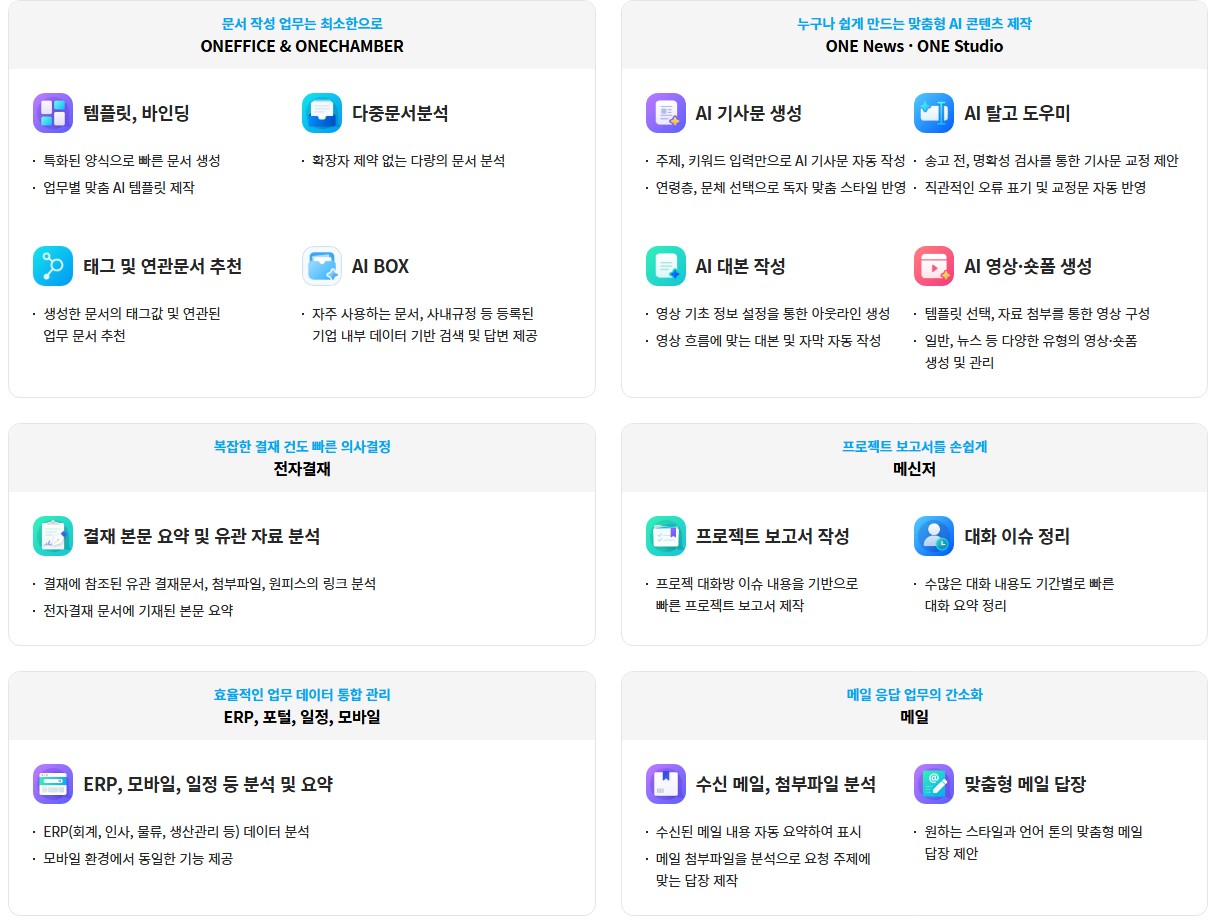 ONE AI는 단순히 업무의 시간과 비용을 절약하는 도구를 넘어서 기업의 업무 환경에 새로운 가치를 만들어 나가고 있습니다.